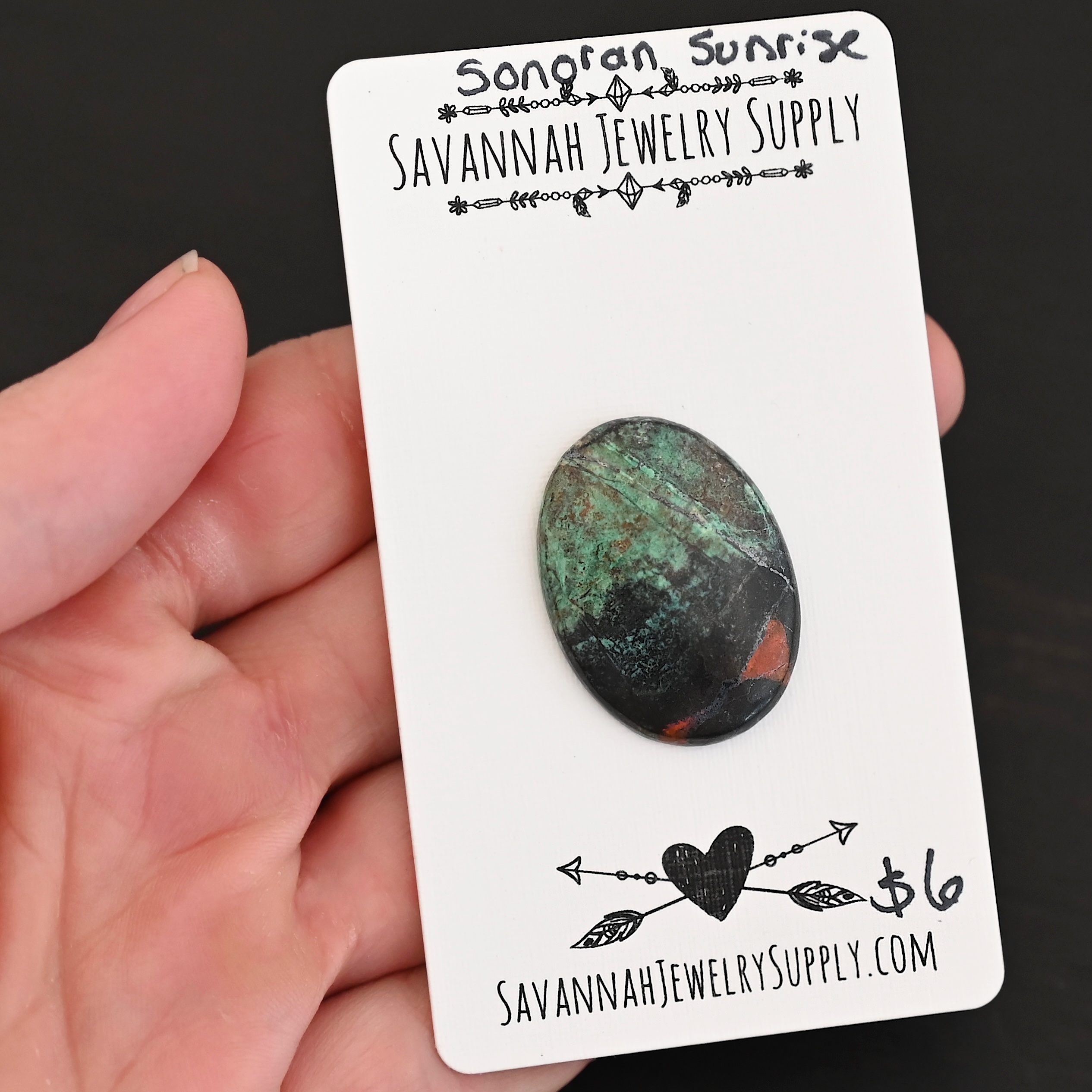 Sonoran Sunrise Cabochon Parcel $6.00 In stock Sonoran Sunrise Cabochon Parcel quantity Add to cart Description Reviews (0) Description Parcel’s name is Sonoroan Sunrise Shown on business card Listing is for exact cabochon shown All stone sales are final Reviews There are no reviews yet. Be the first to review “Sonoran Sunrise Cabochon Parcel” Cancel replyYour email address will not be published. Required fields are marked *Your rating * Rate… Perfect Good Average Not that bad Very poor Your review * Choose pictures (maxsize: 2000kB, max files: 2) Name * Email * Save my name, email, and website in this browser for the next time I comment. Opens in a new window Tweet This Product Opens in a new window Share on Facebook Opens in a new window Pin This Product Opens in a new window Mail This Product Related products Custom Stamped Tag $26.00 – $39.00Price range: $26.00 through $39.00 Select options This product has multiple variants. The options may be chosen on the product page Quick View Quick View Scarlett Chain $137.00 – $163.00Price range: $137.00 through $163.00 Select options This product has multiple variants. The options may be chosen on the product page Quick View Quick View Allie Chain $97.00 – $140.00Price range: $97.00 through $140.00 Select options This product has multiple variants. The options may be chosen on the product page